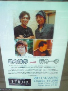 本日は六本木にあるライヴハウス、スイートベイジル(STB139)でスーパーロックギタリストの是方博邦さんのライヴがありました是方博邦(g)、石井一孝(vo)、光田健一(key)、坂東慧(Dr)、石川俊介(b)ライヴのゲストヴォーカルとして登場したのは、応援させていただいているカズさん(石井一孝さん)!そしてベースは聖飢魔II ゼノン石川こと石川俊介さん、キーボードは、元スターダストレヴューの光田健一さん。そして今回私にとってははじめましてのドラムス、坂東彗さん(若いっ!)私のとっても大好きな是さんバンドメンバーなのでもうノリノリでした。取り急ぎ、セットリストをご報告~Ms.Heart (是方さんオリジナル曲)ラードバンド (光田さんオリジナル曲)~以降、vo. 石井一孝~EAGLE (是方さんオリジナル曲)I Remain (ビートルズのカバー)アステカ (是方さんオリジナル曲。石井さんが歌詞をつけて初披露)Romanncing Bird (是方さんオリジナル曲)Heartache, Heartache (是方さんプロデュース石井さんオリジナル曲。石井一孝4thCD「同じ傘の下で」より)No Rain, No Rainbows ( 同じ )Your eyes, your mind (是方さんオリジナル曲)Private Eyes (80年代のダリル・ホール&ジョン・オーツの大・大ヒット曲カバー)パープルサウス (是方さんオリジナル曲)Heart of Earth (是方さんオリジナル曲、歌詞付バージョンは、石井一孝4thCD「同じ傘の下で」より)~アンコール~Back in the U.S.S.R. (ビートルズのカバー)Over the rainbow (オズの魔法使いより)Here, There And Everywhere (ビートルズのカバー)感想などの続きはまた後ほど~