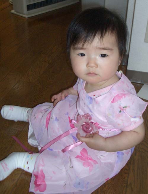 ママとパパが2人とも後輩の結婚式にお呼ばれしたので、あいかも初めて結婚式に出席しました。↑自宅にて・・・(ドレスに着替えて準備中)挙式にも列席。披露宴の途中であいかの名前が呼ばれ・・・数日後にお誕生日を迎えるあいかの為にケーキのプレゼントが―予想外のプレゼントにパパとママはびっくりでした。3時間程の披露宴でも一度も泣く事無く過ごせました。ただし夕方からのお式だった為終わりの頃にはおねむに・・・最後のお見送りの時にはママに抱かれて就寝でした。