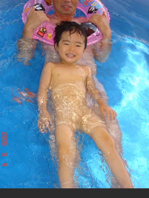 今日も暑い1日でしたね。午前中は、あいかとじじ&ババ&ママで親戚の家へ・・・(じじの用事でお付き合い)朝からきちんと「うんち」と2回、「おしっこ」と1回言え、順調な滑り出し。うどんやさんでお昼を食べている時も、食事中でしたがきちんとママに教えてくれました。その後、実家に戻って、DVDに集中している様子。テレビをみながら、「おしっこ」と言った瞬間に出てしまいましたたまには教えるの忘れちゃうよね・・・パンツが濡れてしまったし、そろそろプールに入ろうか~という話になり、午後からは、お庭でじじと一緒にプールに入りました。はじめて浮き輪を使って泳いでみました。ママは日陰で見学&カメラ撮影係り。 ばた足をしながらあいかは、けっこう前に進めるのね♪今度は、じじの上で仰向けになって浮き始めました~オールヌードで失礼します↓プールのあとは、しっかりおしっこ&うんちを教えています。