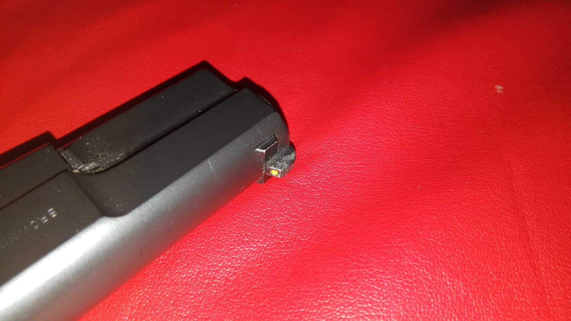 ハイパワーに合う小振りなノバック・サイトってのがなかなか無くてWAの自社製カスタム・パーツとして出されていたガバメント用のノバックサイトをチョイス。ただそのままだとノーマルのガバに向か光で取り付けれるようにデザインされていたために後端下部がスライドに合わせて半円だったのと、ノーマルのフロントサイトに合わせるために低くデザインされていたので形状変更して取り付けました。各社からノバックサイトをつかったカスタムガバが製品化され、それこそ旧MGCも含めかなりな数のノバックサイトが出ていますが、その多くは残念ながらガバ向けのデザインなのでタナカからノバック・カスタムのハイパワーが出てくれると嬉しいですよねぇ・・・。
