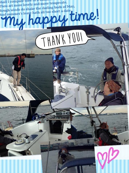 今週も沖に出た(^.^)またまた人の船で(笑)朝から天気良く風は弱いものの暖かく海上お散歩日和だった(^^)帰港してからのアツアツ小龍包で体も暖まったよ~~もう少し暖かくなったら自艇でソロセーリング出来るかなって思わせる陽気だった(^。^)けど冷えると怪我個所ほんとに痛い(涙)