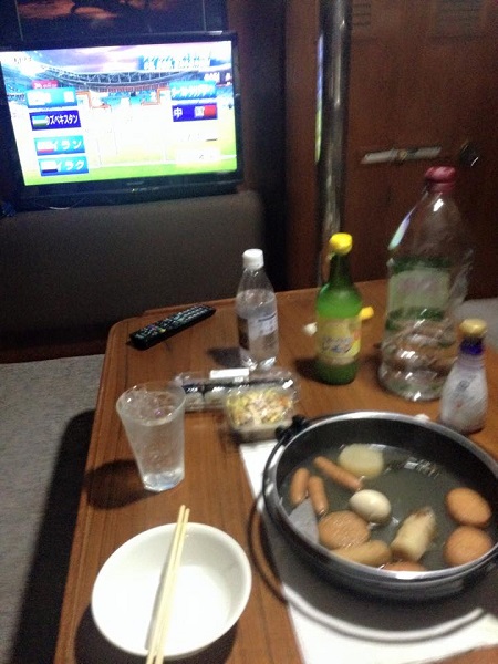 おでん食べながら船テレビでサッカー観戦(笑)後半始まった‼頑張れーー‼