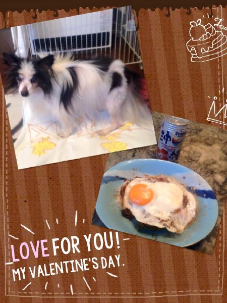バレンタインな朝は老犬とお留守番(・・;)デベちゃん歳で目は見えてないし耳も聞こえない(._.)やっと立って歩いてます。下の世話が大変です。デベちゃん食欲旺盛なので食事中・・・私も朝から特製ロコモコにオリオンビールで・・いただきます(^.^)