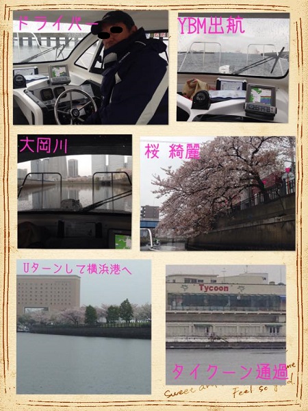 マリーナのレンタルボートで横浜大岡川へお花見に行ってきた(^^)土曜日の予約だったけど悪天候で出航禁止となり取り止めで諦めていたけど流泰丸オーナー機転を利かせ翌日曜のキャンセル艇をゲットして行けたよ〜(^^)大岡川で花見のあと横浜港内から違う川へ入り掘割川へ・・・リバークルーズしてYBMへ帰航した。レンタル代、燃料代、昼食代でお一人様¥3.800-の格安ツアーでした(笑)去年は1週間早すぎて桜がまだ蕾だったけど今年は1週間遅くしたら暖かで桜が散ってしまうのではと心配したけどまだ7割位の桜が残ってた・・・・天気も良くは無かったけどお花見も出来たし川を2本もリバークルーズ出来たし楽しかった!!