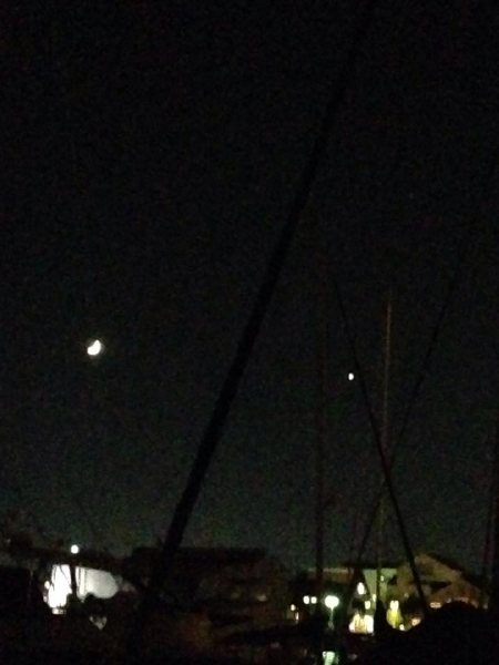 5/22(金)21:20月と金星が同じ高さに見える特別な日・・・ってこの事・・・金星どれだかわからないので(・・;)違うかも(笑)5/23(土)14:59マリーナ主催の3・4・5月期新規契約オーナーさんのウェルカムイベントにクラブ代表で行きました。マリーナ内全4クラブが来てて、まるで学生時代の部活勧誘合戦みたいでおもしろかった(笑)5/23(土)23:07今夜は久々に近所のそば屋さんアダムスで晩御飯にした。その後wikiwikiにお泊り保育のカグーチームと楽しく呑み(^^)騒音発生装置を何処に寝かすかで協議して今消灯(-_-)zzz —5/24(日)14:00今朝はカグーチームとサンドイッチで朝食。雨の予報の中チームは船底作業へ行きwikiwikiは一度雨じまいしたものの全く雨の気配なし。昼食はwikiwiki&スパンコールで持っていた餃子にwikiwikiでご飯を炊き作業終わりで戻ってきたチームと流泰丸で小宴。夕方またまたwikiwikiに集まりコーヒータイムで解散・・・結局は雨は降らずに皆日焼けした日曜日でした。今週末はディンギー&BBQだ・・・・雨降らないでね~~~~~