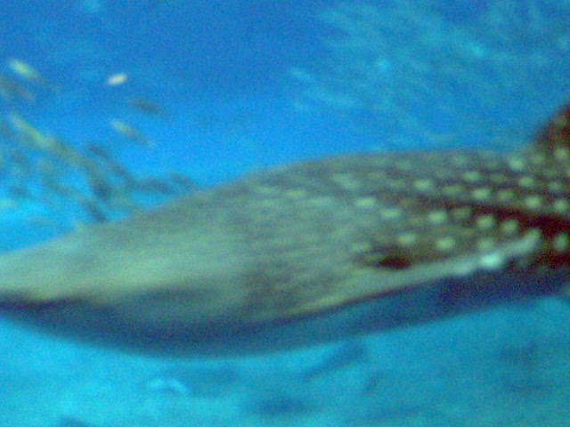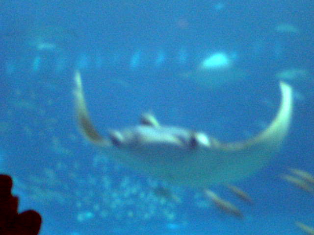 白い砂浜を離れ、次に向かったのが「美ら海水族館」。世界一のアクリル板越しにジンベイザメやマンタを見られる。生きたジンベイザメやマンタを見たのは初めてだったので、その大きさにその優雅な泳ぎにしばし呆然と眺めてしまった……。動物園や水族館で動物たちが自由を束縛されている事には心が痛むが、それら施設がなければ我々の様な一般人には動物と出会う機会がない。人間のエゴなのでしょうが……。ジンベイザメは(多分)世界最大の鮫です。そして、世界最大の魚類です。その体長は12mを越すものまでいます。世界最大の鮫と言っても性格は大人しく人間を襲うようなことはありません。主食はプランクトンなどの小さな生物です。(しかし、海で泳いでいてジンベイザメに出会ったら、恐いだろうなぁ……^^;)ジンベイザメの名前の由来は「甚兵衛羽織(じんべいばおり)」の模様に似ている事から付けられたと言われています。しかし、もう少し気の利いたネーミングが出来ないものでしょうかね……^^ジンベイザメはその生態がほとんど解明されていません。胎生(体内で卵からふ化して生まれる)事が10年程前の判明した程度で、どの地域を回遊しているのか、交尾をするのかなど分からない事がほとんどです。ちなみに日本の水族館では、沖縄の「美ら海水族館」と大阪の「海遊館」で飼育されています。