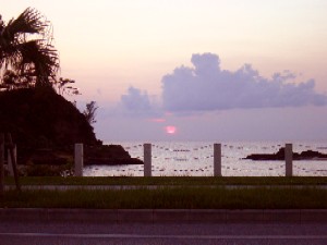 夕食を食べる為、ホテルの屋台村の様な所へ行った。丁度夕陽が沈みかけて最高に綺麗だった。料理の方は、「ゴーヤチャンプル」「タコライス」などをみんなで分けて食べた。当然。私は「オリオンビール」を飲みながら……♪気温は暑く、夕日を真正面から受けていた為それだけで焼けた……^^;昨夜は早く眠ればいいものをインターネットで遊んでいた為、2~3時間しか寝ていなかったのと旅の疲れから、午後10時には眠ってしまった。こうして、沖縄の初日が終わった……。