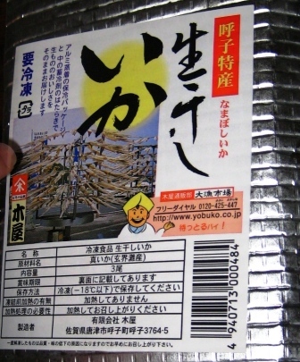 呼子の烏賊のうまさは、私にとって美味いもんベスト10に入る逸品です。とくに活き造りの半透明な烏賊のうまさは格別です。最近は久しく行っていませんが、呼子の朝市で売られている烏賊の一夜干しも絶品でした。これは高速道路の金立SAで売られていた冷凍もの。烏賊の「生干し」。朝市で帰る一夜干しに比べると、かなり固い食感で、だいぶ違うものですが、酒の肴には美味です。木屋は呼子にあるお店で、烏賊製品はもちろん、めかぶなど数多くのおいしいものを取り扱っている魅力あるお店。また呼子の朝市に行ってみたくなりました。それには延岡を朝4時に出発しないといけません。それには3時起き。。。うーむ、土曜日なら不可能じゃないなあ。下サイトが、以前鹿児島に住んでいたころに行った呼子朝市ツアーの様子。http://winewine.at.infoseek.co.jp/gourmet02K040313yobuko.htm