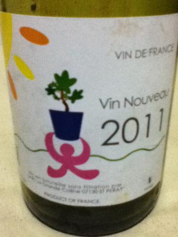 ヴァン・ヌーヴォー・ルージュ[2011]/ラ・グランド・コリーヌ 毎年買っている銘柄です。白もありますが、まずは赤から。ご案内の通り、日本人の方が造っています。このラ・クランド・コリーヌのいつものベーシックのキュヴェのル・カノンの赤は、クロ・デュ・テュエ・ブッフのシュヴェルニィ・ルージュと並び、私の中の、赤のハウスワイン候補の銘柄です。まだお店によっては在庫がありますね。こちらと、ほぼ価格帯の一緒です。フランスの自然派ワイン、私は赤はいちばんローヌが「歩留まり」がよい気がしています。ロワールもいいですが、けっこう造る人によってはきつい香り(強い還元香)になっていたりします。アルザスの自然派はみな美味しいのですが、赤が少ないですからね。その点ローヌは、選択肢も多く、安くても美味しい自然派の赤が多い気がします。たぶんグルナッシュやシラーといったローヌ系の赤品種と、自然派の造りの相性がよいのでは?という気がしています。熟成もそこそこ期待できる、と思います。寝かせたグラムノンなんて、香りだけでクラクラしますもんね!さて、このラ・グランド・コリーヌですが、通常のル・カノンはちょっと保存が悪いと味が変わってしまうデリケートなワインなのですが、こちらは新酒なので、そんな心配もありません。香りは、マセラシオン・カルボニックらしい新酒らしさがあります。口に含むと最初、わずかな発泡を感じます。味わいは、胡椒っぽいスパーシーなニュアンスがあって、そこがボージョレ・ヌーヴォーと大きく違う点です。この重くないけどパンチがあるこの味わいが、好きなんですよね。ネットで調べたら、お店によってシラー100%と、ガメイが入っているという違う記述がありましたが、私はガメイのニュアンスは感じられませんでした。「これは明日のほうが、もっと美味しいなあ」と思いながら飲み進めていたら、あっという間に飲み干してしまいました。いかん、日曜日の夜なのに。案の定、眠けが……。30分の仮眠をとった後、グラスを洗い、風呂に入って、眠りました。