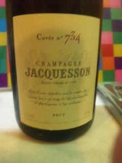ジャクソン・キュヴェ#734[NV]/ジャクソン最近、ヴィンテージシャンパーニュを止めて、リューディー(畑名)別をリリースして、高評価を受けたジャクソン。シャンパーニュにはまり始めた身の上としては、ちょっと困る話です。だって、畑名でどれを選べばいいなんて、わからないですから。全部買うと、お金はかかるし、前のヴィンテージごとのほうがよかったのに、と思うわけです。これがブルゴーニュだったら私の周りにも、ジュヴレだったらくクロ・サン・ジャック、ニュイ・サン・ジョルジェだったらヴォークラン、ピュリニィ・モンラッシェだったらコンベット、というように、自分の好みの畑名を言うワイン好きがけっこういますが、シャンパーニュの場合「アイ村だったらラ・コート・ファロンがいいよ」なんて人は、たぶんいないと思います。もちろん、畑名付きのシャンパーニュなんて少数派ですからね。これから、そういう畑名にこだわるシャンパーニュ・マニア、増えるんでしょうか?さてこのノーマル・キュヴェのジャクソン、#734は2006年がベースなんだそうです。ノン・ヴィンテージだけど、番号が変わるごとにベースのリザーブワインが変わる、珍しいメゾンです。とここまで長々と書いてきましたが、今回飲んだボトルは、おそらく本調子ではない1本でした……。ブショネではありませんでしたが、軽い熱劣化でしょうか? 味はどことなく平板で、わずかに金属的な苦みのニュアンスを感じます。う~ん、残念! ひさびさに状態の悪いシャンパーニュに出会ってしまいました。もちろんジャクソン(さん)のせいではありません。悔しくて眠くなりませんでした……。