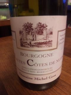 オート・コート・ド・ニュイ・ルージュ[2007]/ドメーヌ・ミシェル・グロご存知、ミシェル・グロ。熱狂的なファンはいないけど安定感のある造り手、というイメージですよね。でも、好きなんです。ご存知、モノポールのクロ・デ・レアで、古酒を含めてアタリが多かったので、好印象につながっているのかもしれません。最近ヘビーローテーションの店で、オー・ブリュレが安いのを発見!ミシェル・グロヴォーヌ・ロマネ・プルミエ・クリュ・オー・ブリュレ[2007]赤 [750ml]一緒に、オート・コートも買いました。ミシェル・グロオート・コート・ド・ニュイ・ルージュ[2007]赤 [750ml]バックヴィンテージで2,000円ちょっとは、嬉しいです。2007年という、酸が強そうな年の後背地のワインですから、何となく飲む前にイメージがありました。一口飲んでの感想は「やはり!」。酸味基調ですが、数年の瓶熟でこなれてきてます。果実味はフランボワジーな赤いイメージ。いわゆるチャーミングなワインです。先日、外でルイ・ジャドのボトム、クーヴァン・デ・ジャコバンの赤(2008年)を飲んだのですが、そちらも赤系果実&酸味基調でしたが、それよりははるかに表情があるワインです。平日、こういうワインをブルゴーニュグラスで飲みながら、肉じゃがのような、どうってことない家庭料理を食べていると、「う~ん、これはこれで悪くないなあ」と思ってしまいます。小さな確かな幸せ、ってやつでしょうか。小市民?これで、あと片付けをしないで眠れたら、もっと幸せなんですけどねえ……。