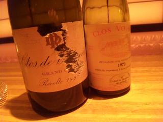 クロ・ド・ヴージョ[1990]/ドメーヌ・マルク・ルジュー・ドゥバンクロ・ヴージョ[1970](ハーフ)/アルフレッド・エジュランドン・ペリニヨンの古酒をいただいたら、「足るを知る」なんてカッコをつけていられなくなってしまいました。赤ワイン選び、ハズしたくありません。そこで「90年のブルゴーニュの赤で」とリクエスト。90年、グレート・ヴィンテージですから、ハズレはないはずです。オーナーは6本のワインを持って現れました。そして、その6本のプレゼンテーションが始まります。この話芸が、もう一種の芸術です。知らない造り手のラトリシエール・シャンベルタン、アラン・ブリュゲのジュヴレ・シャンベルタンとジュヴレ・シャンベルタン・ヴィエイユ・ヴィーニュ。これには「高いヴィエイユ・ヴィーニュのほうは、はっきり言っていま美味しくないです」という解説が入りました。知らない造り手のクロ・ド・ヴージョ、ダニエル・リオンのヴォーヌ・ロマネ・レ・ショーム、造り手失念のアロース・コルトン。ダニエル・リオンと迷いましたが、結局クロ・ド・ヴージョにしました。オーナーの「甘いです」の一言が決め手になりました。造り手を知らなくても、彼の言うことは間違いありません。いい古酒だけが持つ、あの甘みが味わえるのなら!1990年のクロ・ド・ヴージョ、最初から深い香りで攻めて来ました! いい年が、きれいに年月を重ねた香りです。そして一口。うん、きれいな甘みが。これぞ、グレート・ヴィンテージ! 完熟感のある果実味が、うっとりするような熟成香を伴って攻めてきます。。ヴォーヌ・ロマネのような官能性も、ニュイ・サン・ジョルジュのような土のニュアンスもありませんが、球体感のある、素晴らしい味わいです。こういうワイン、意識せずにどんどん飲み進めてしまいます。メインの鹿の前に飲み干してしまいました……。「ちょうどその20年前の、ハーフのクロ・ヴージョがありますよ」と、誘惑的な声がかかりました。ここまで来ると、もう止まりません。「お願いします!」で、1970年。こちらは、クロ・ド・ヴージョではなく、クロ・ヴージョの表記です。こちらは、円熟の香りと味わいでした。果実味は後退していますが、その分1990年よりも、媚惑的な甘みがありました。香りはなめし皮、トリュフ、スーボワ。1990年の強さはありませんが、これもまた美味しい!陶然とした気持ちになって、店を後にしました。帰りの電車、立っているのがやっと、でした。