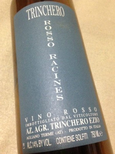 ロッソ・ラシーヌ[2008]/トリンケーロ昔、このワインの名前はバルベーラ・ダスティ・スペリオーレだったと思います。中身は変わっていない模様。アスティのバルベーラの名手と言われるトリンケーロ。若樹から造られるこのキュヴェは、昔はバルク売りしていたそうですが、インポーターのラシーヌさんがその質の高さに目を付けたそう。そんなこんなで、このワインの名前が、インポーター名になった模様です。ネットで探せば、2,000円以下で入手できるようです。2001から、とびとびで飲んでいますが、一貫して質の高いバルベーラだと思います。酸があるデイリー赤が飲みたくて、ブルゴーニュというキブンではない時、私はサンジョヴェーゼかバルベーラを選ぶことが多いかもしれません。どっちかというと、より赤い果実を求めている時はサンジョヴェーゼ、黒というより、より鉄っぽいうニュアンスが欲しいときは、バルベーラなのかもしれません。トリンケーロのこのワインは、多めの酸が美しく、いい意味で鉄さびっぽさがある強めの果実味と上手にバランスしていて、つい杯が進んでしまいます。ひさしぶりに飲みましたが、コスパ高いです。バルベーラ、好きです。