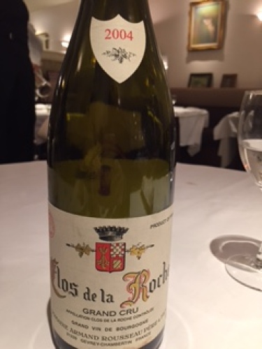 クロ・ド・ラ・ロッシュ[2004]/ドメーヌ・アルマン・ルソー改めて考えてみて、このGCがこの蔵では、上から5番目ということはスゴイことですね。いわゆるビルの上のレストラン街にあるフレンチというのは、ワイン目当てのお客さんが極端に少ないかもしれません。特に老舗のお店では、長年&年配が多く、ワインを奢る方もボルドー好きが多い?たまに行くそんなお店で、ワインリストのブルゴーニュの項の最後の2本が、04のルソーのシャルムとラ・ロッシュでした。それより前のリーズナブルなものはコロコロ変わるのですが、その2つは不動。レストラン価格としては、とっても良心的ですが、まあそうなもんなんだろうなあ、と横目で眺めていました。しかし先月伺ったら、ソムリエさんがすでにワインをオーダー&飲んでいる段階で、「シャルムが売り切れて、クロ・ド・ラ・ロッシュがあと1本になってしまいました」と話すものだから、思わず取り置きを依頼。今週、それを飲みに再訪した次第です。現行のルソーは、個人的には守備範囲外のお値段という認識です。ちなみにこの04のラ・ロッシュは、最新ヴィンテージの村名の、ネット実勢価格の約2割増し。ワインバーだったら、もちろんこんなに長く残ってなかったでしょう。この手の高騰してしまったブルゴーニュは、ワイン目当てのお客さんが少ない老舗のフレンチで、滞留在庫を探すしかないのかなあ、と思ったりします。ちなみに04のルソー、2年前に村名を飲んだら、ジャストに飲み頃でした。「いま、いいと思います」というソムリエさんのご託宣通り、開けたてから芳香。石やシナモン、鉄、皮、ごく軽くトリュフ。赤優勢ですが、黒も混じった果実味は、多めのミネラルに支えれていい感じです。1時間もすると香ばしさと甘みが増してきて、04のネガティヴさを感じさせない、大きい酒質のピノを味わうことができました。もちろん、私にはどこが瑕疵かはわからないのですが、球体というにはややいびつで、「最高」「最上」といった味わいには一歩及ばない感じもするのですが、それでもある意味「最良」のワインを、ゆっくり味わう時間はいいものです。いやむしろ、そのどこか足りないところがあることが、よいのかもしれませんが^^