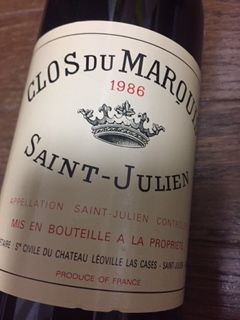 クロ・ド・マルキ[1986]/サン・ジュリアンひさびさに熟成ボルドーが飲みたくなって。想像以上に、若かったです。近年、ラスカーズのセカンドではないという主張がなされ、セカンドとして別銘柄が登場しましたが、この時代はきっとセカンドなのだと思います。違う畑でつくってきたと言われていますが、86はとにかく収量が多かったとされるヴィンテージで、クロ以外のぶどうがアッサンブラージュされたのでは?と思います。プラム系の黒系果実、シガーとややシダのニュアンス。とはいえポイヤックやペッサクほど、香りに特徴は感じません。良年らしく果実味はしっかり、ですが密度はそこそこで、やはり収量は多かったのだろうと想像できる味わい。しかしながら、牛肉と山羊系チーズと合わせると、王道ボルドーらしく、グッと美味しく感じられました。すでにタンニンはしっかり重合していて、酸度はそこそこなので、この先寝かせてよくなるかは不明ですが、妖艶な香りが出てくるのは、まだまだ先に思えました。