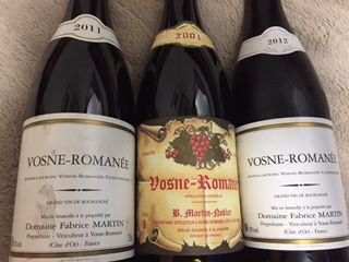 ヴォーヌ・ロマネ[2011]/ドメーヌ・ファブリス・マルタン先日、恵比寿のワインバーで飲んだマルタン・ノブレの2001年は、ある意味理想的な村名ヴォーヌ・ロマネの味わいでした。実は、2000年からファブリス・マルタンに代替わりしていることを知ったり、知り合いのショップに動かない在庫になっていた1993年のエシェゾー(穏当な値段です)の評価があまり高くないことなどを鑑みて、代替わり後が美味いのでは?と推察して、2001年を1本買った後に、2011年と2012年も買い足しました。ファブリスは村名しか造っていないようで、ジュヴレとあとニュイ・サン・ジョルジュも存在を確認しましたが、バックヴィンテージは2011年以前は見つかりませんでした。この2011年は、なじみのワインショップに残っていたもの。ネットでは、コレ2本と2010年のジュヴレが残っていることになっていたので、全部欲しいと電話したら「ヴォーヌ・ロマネ1本しか残っていなかった。状態も……」との返事。けっこうネット上と実際の在庫が合っていないのです(でも、ネットでは売り切れになっているバックヴィンテージが、実店舗にはあったりするので、悪いばかりではありません^^)。まあそんなこんなで買った、2011年を開けてみました。この飲んだ2011年のボトルが、10年後に2001年のようになるかといえば、そうは思えない味わいでした。香りはVR的でしたが、コアの味わいが弱く、酸度が低い柔らかい味わい。この村名、ダモードの古樹から造られているそうですが、もっと標高の低い畑のクロ・デ・レア的な味わい(ただし7~8掛け)でした。まあ村名としては充分なレベルで値段なりに楽しめましたが、スーパー村名とは言えず。2012年を飲む前に、もう1回2001年を飲んだ見ようと思いました。