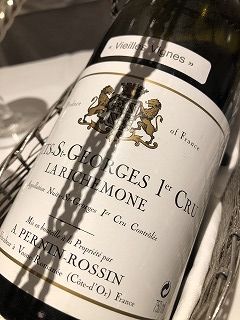 ニュイ・サン・ジョルジュ 1er Cru ラ・リシュモンヌ V.V.[1993]/ドメーヌ・ペルナン・ロサンご存じ、今は無きロサン。香りに腐葉土と黒トリュフがよぎり、期待しましたが、果実味が縮こまっていて、なかなか伸びてくれませんでした。健全で不味くはないのですが、93のネガな部分が出たような味わい。かもです。同銘柄の86のほうが、愉しみの多い味でした。