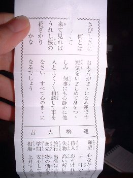 近場にお寺があるらしくはじめて除夜の鐘を聴きながら年を越しました。なかなか風情のあるところに引っ越してきたものですで、今日のお昼くらいに喪も明けたことだし近所に祭られた氏神様にご挨拶。おみくじは大吉でした(・∀・)今年はやっぱし、始める年なのかな・・・短気はダメて書いてるね~気をつけなきゃww