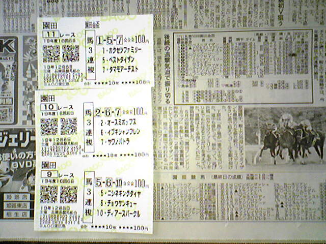 こんばんは~♪実は昨日古くからの友人が私の職場に遊びに来たもので、ついつい釣られてやっちゃいました~お馬さん(^^; 結果は・・・、惨敗400円しかやらなかったのでほんのお遊び(^^;でも楽しい!!!勝ち馬投票場には行ってないのですが、話を聞いていると面白い暫くやみつきになるかも!!!よい情報があればカキコカキコ・・・な~んてね(^^;
