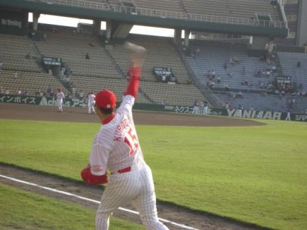 やりました~!!!本日、カープ勝ちました~\(^。^)/トラきちさんには申し訳ないのですが、勝たせていただきました♪すでにカープ3連戦中2勝されてるから1勝くらいさせてくださいね(^^;新井選手は1戦目大ブーイングを受けてからは2戦目3戦目と元気が出ませんでしたね・・・。愛情の裏返しなので、離党式程度で受け止めて阪神の主砲として、又日本の主砲として頑張ってくださいね♪ブーイング実はみんな笑顔でしてたんですよ(^^)b今日の試合はホント石原捕手の活躍に尽きますね♪ブラウン監督の2番起用がずばりな1日でした!!!でも、もう少し早く勝ってほしかった~(-。-;私は地元開幕4月1日に行ってきたんですよ~!!!最後の晩餐のイメージでしょうね(^^)b市民球場最後の年になるんですものね。なんとなく寂しいですね。私は夏の高校野球は市民球場の行進から始まったので懐かしくて思い出いっぱいなので寂しくてしょうがないです。選手の練習風景です。正面にいるのが嶋選手!!!やっぱりかっこいいです。まだあたりはでてませんが、眠れるゴジラが目を覚ますのも時間の問題でしょう(^^)v手前が一昨年阪神から移籍してきてくれた喜田選手!!!今回の阪神戦絶対活躍してくれると信じてたのですが・・・、出番がまわってこなくて本当に残念(-。-;うちのお兄ちゃん!!!未来のカープ選手のスイング???いまいち体重がのってないスイングではありますが(^^;本人はいっちょ前です!!!カープ入団してくれたら100%気絶しますね~(^^;今日はカープ勝って本当に良かった~!!!