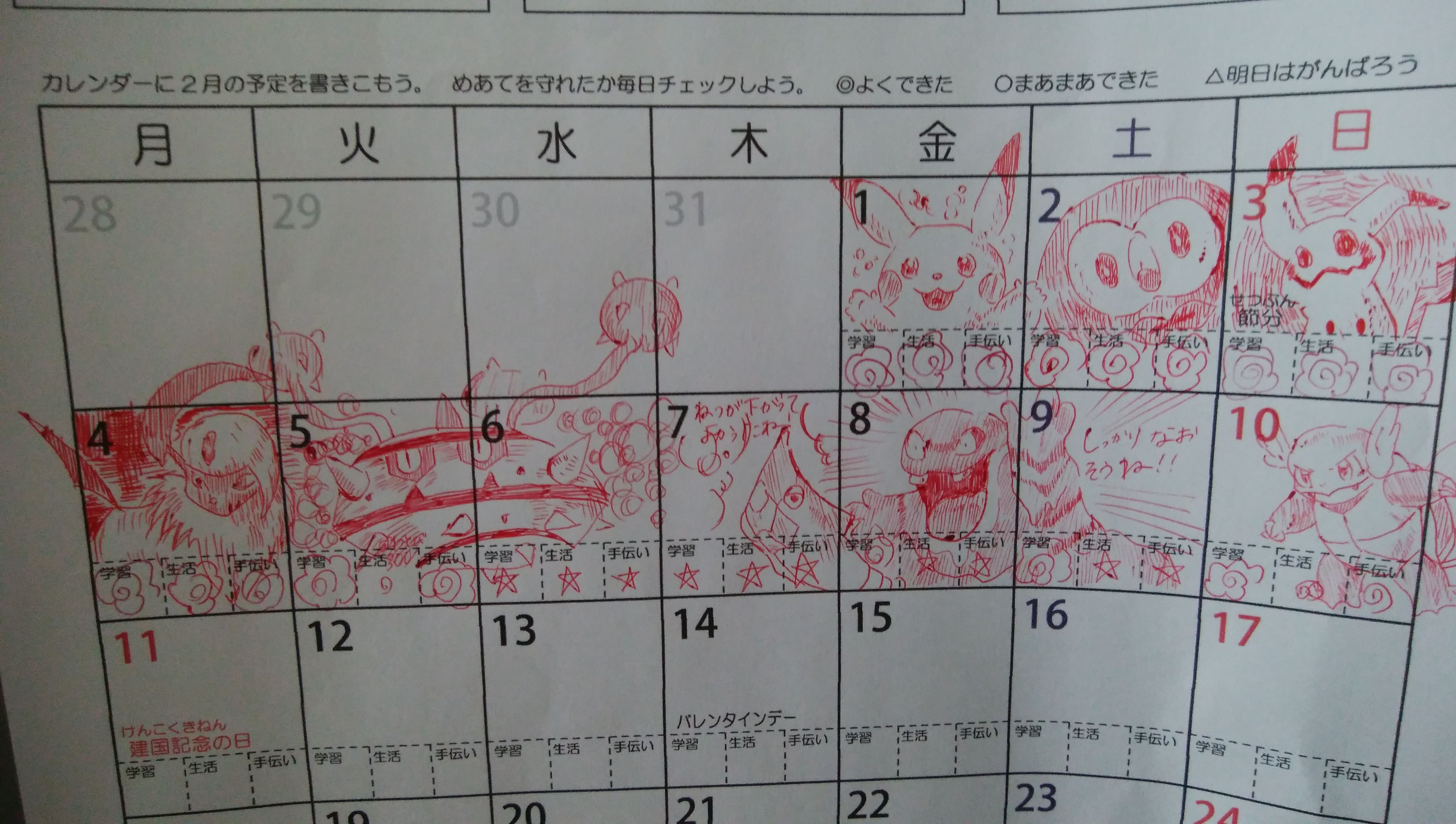 下描きもなしで、赤ペンでスラスラ描いてますからね…中学生の時、美術の評価が2だった自分には、神業にしか見えない(苦笑)しかも、つながってるヤツ、毎日、半分ずつ描くとか、スゴすぎ(笑)ポケットモンスター Let's Go! イーブイウチにあるのは、こっちですね♪