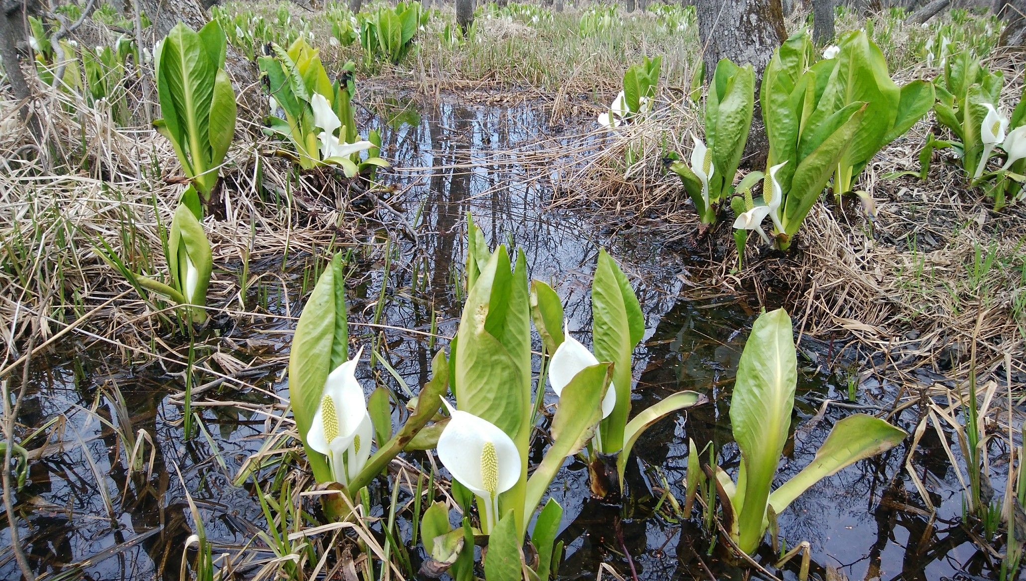 石狩市のマクンベツ湿原。 若干、時期が早いようだけれど、キレイに咲いてましたよ♪(笑)わが家のカメラマンたち(笑) おいおい、木道から落ちないように気を付けてよ! 落ちたら…この中に、じゃっば~ん!! だからね(苦笑) うん、天気も良くて、楽しかったですよ♪※2019年4月20日撮影ポストカード【お花】水芭蕉(ミズバショウ)アップ (pin-FW176)やっぱりプロが撮ると上手?(笑)