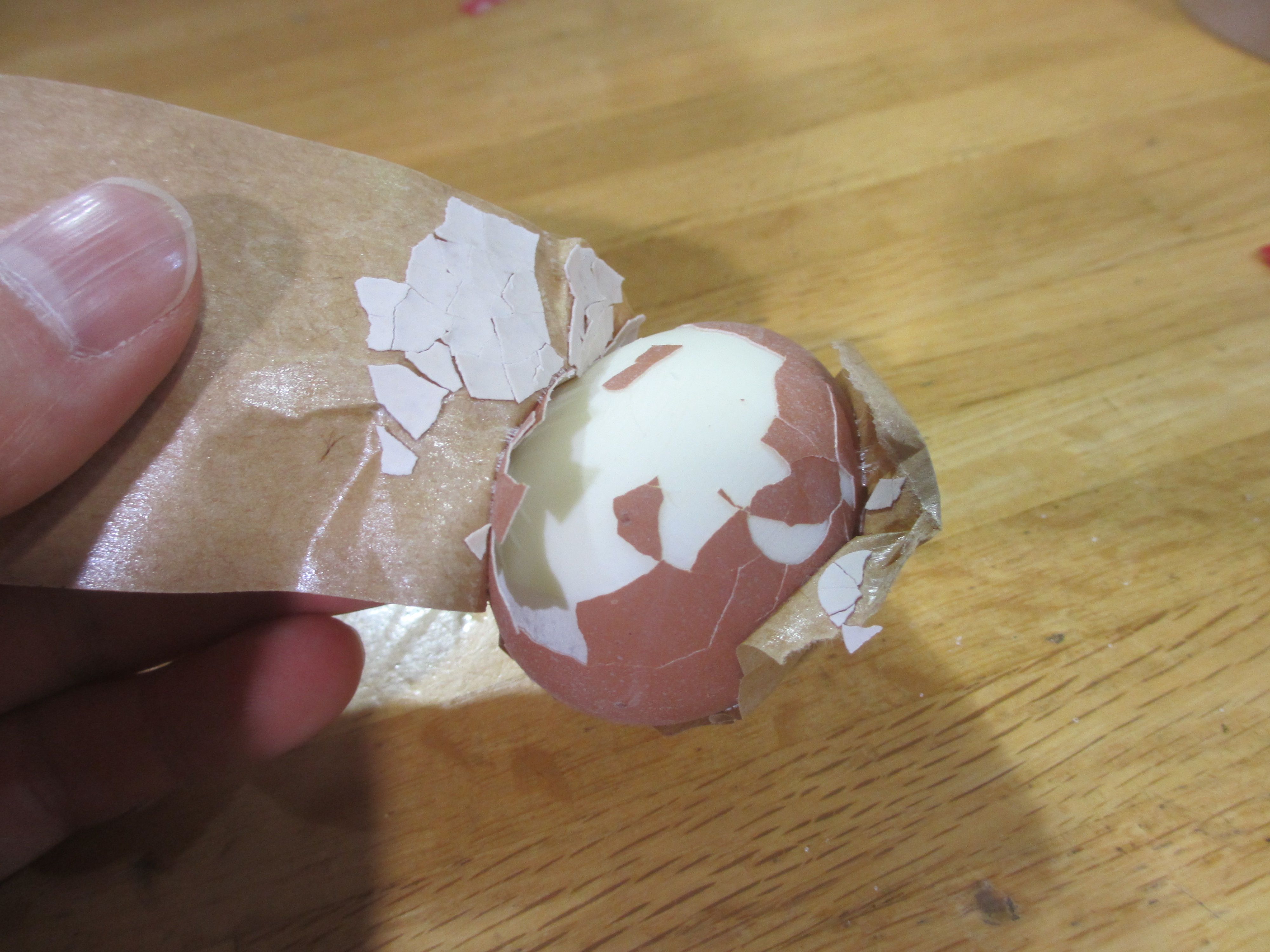 正しいむき方は、上の写真のように、あっつあつの温泉卵をガムテープで巻いて、テーブルにゴンゴンして、ガムテープをはがすと、あら不思議♪(笑)