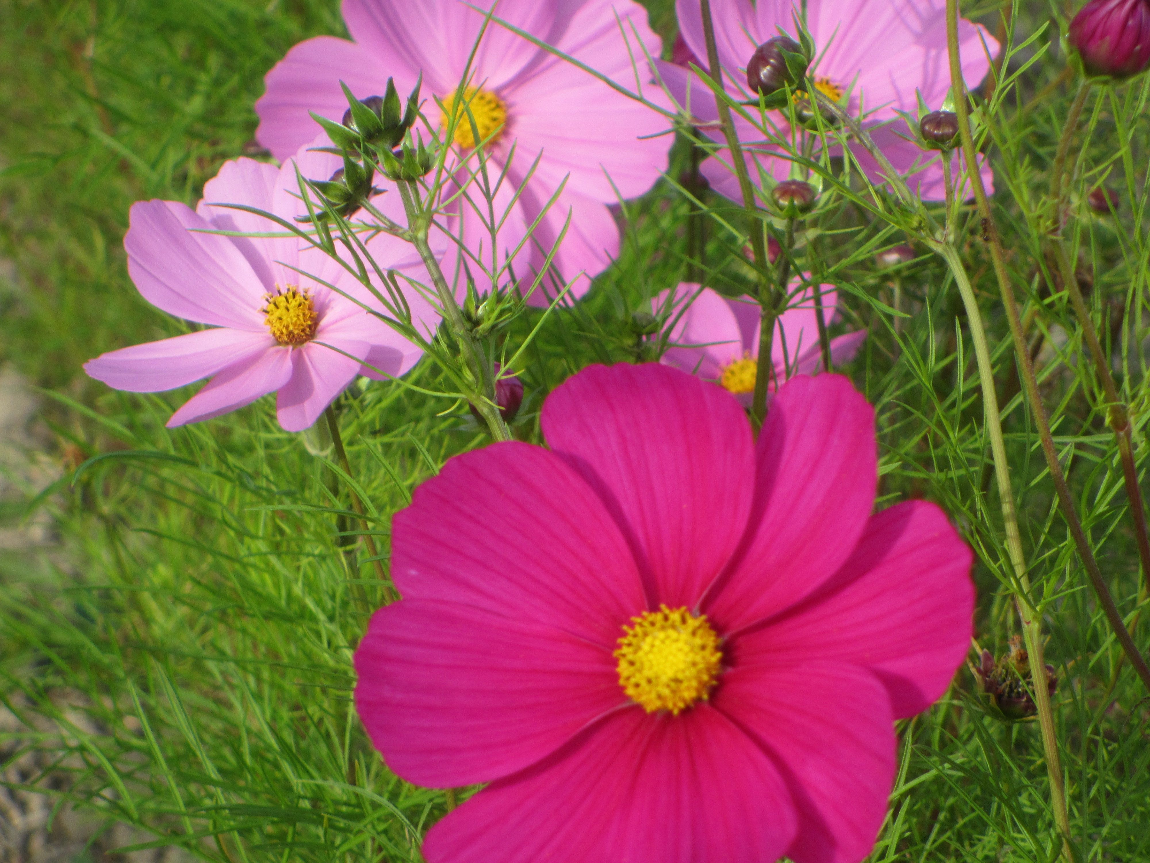 薄いピンクに、濃いピンク。 白はもちろん、八重咲のものや、黄色いコスモスなど色とりどり♪