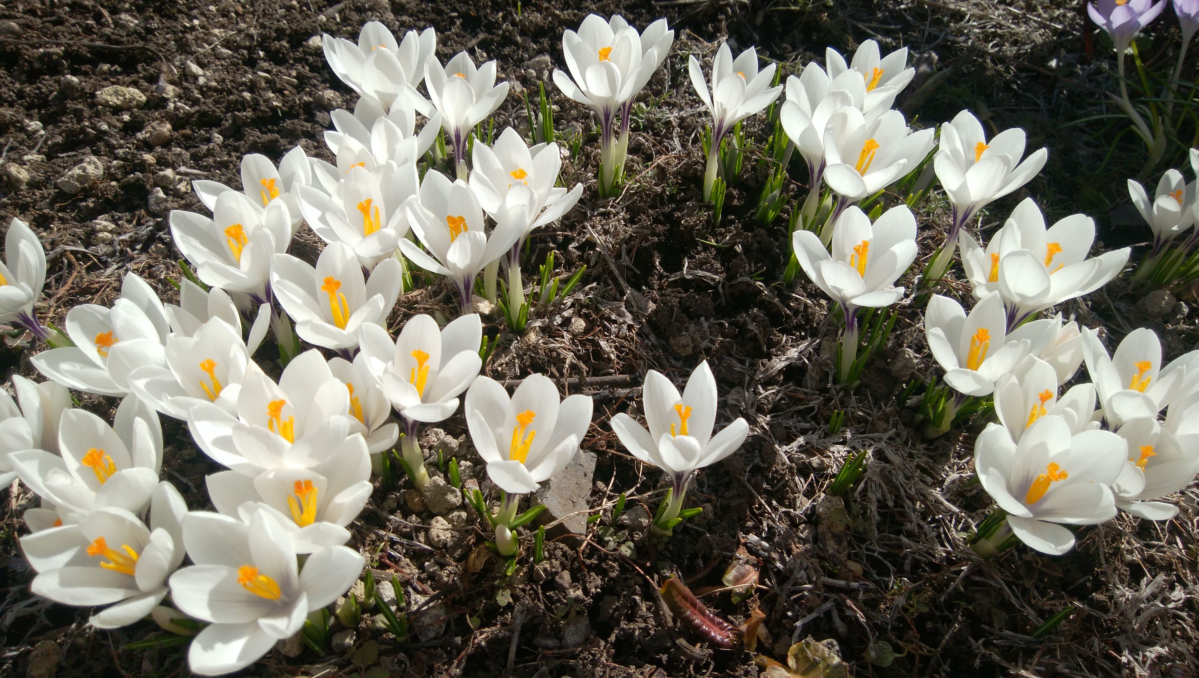 白いクロッカスも咲いていますが… あれ? オレンジ色のは、どこに行っちゃったの??
