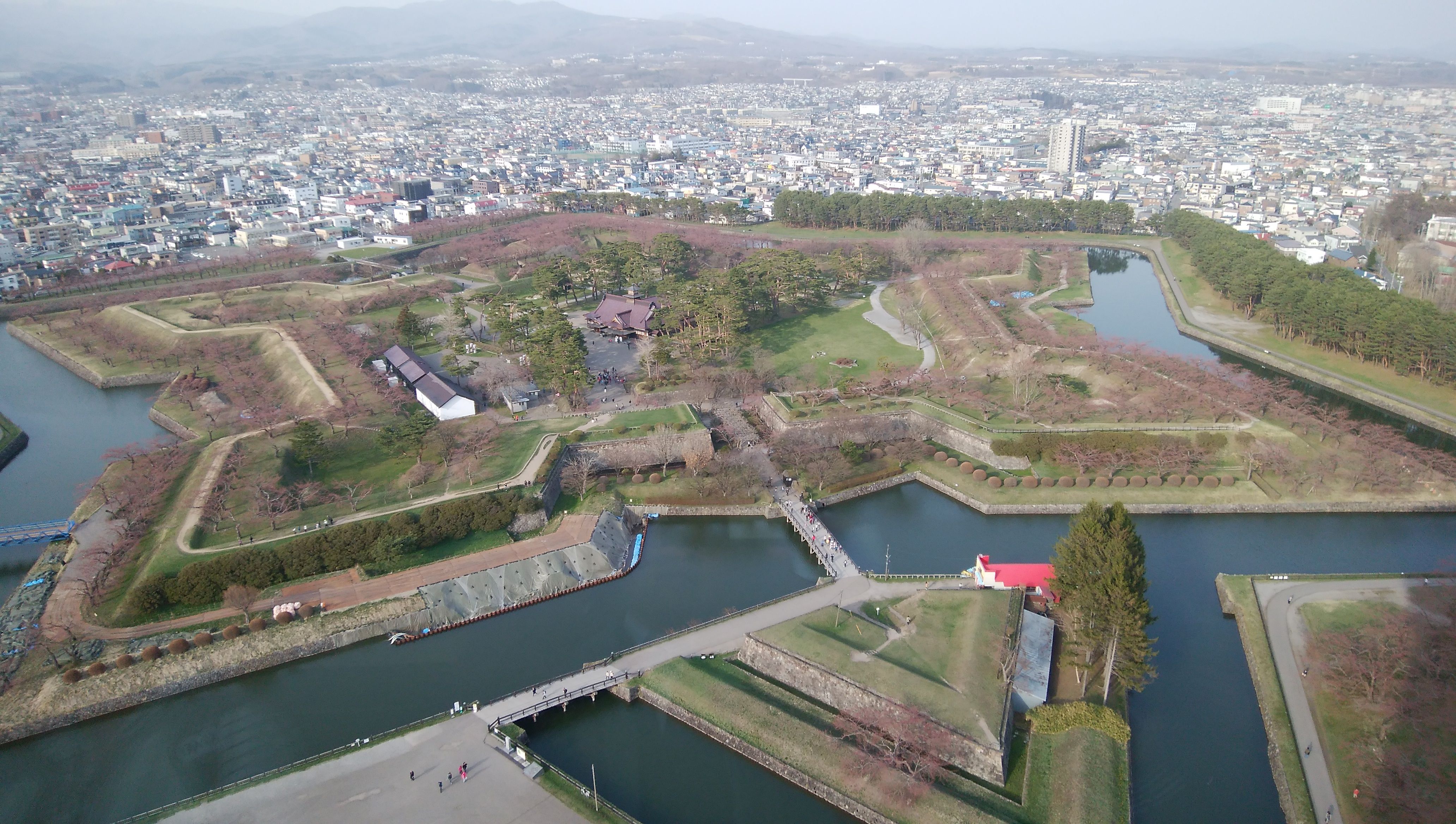 続いては、函館、五稜郭タワーからの眺めを。 もう、チラホラ咲き始めている桜がキレイ♪