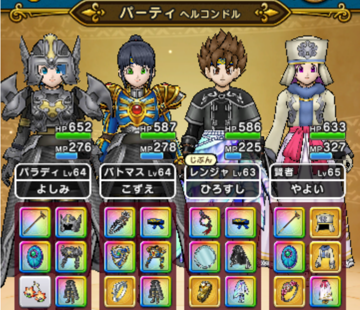 レベル64のバトマスは、黒嵐、トルナード、黄竜はちまき、光上、凱歌下、アクセは女神と魔導将軍。