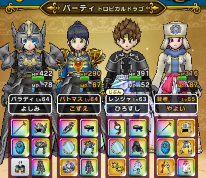 レベル64のバトマスは、黒嵐、プラチナ、黄竜はちまき、光上、凱歌下、アクセは女神と魔導将軍。