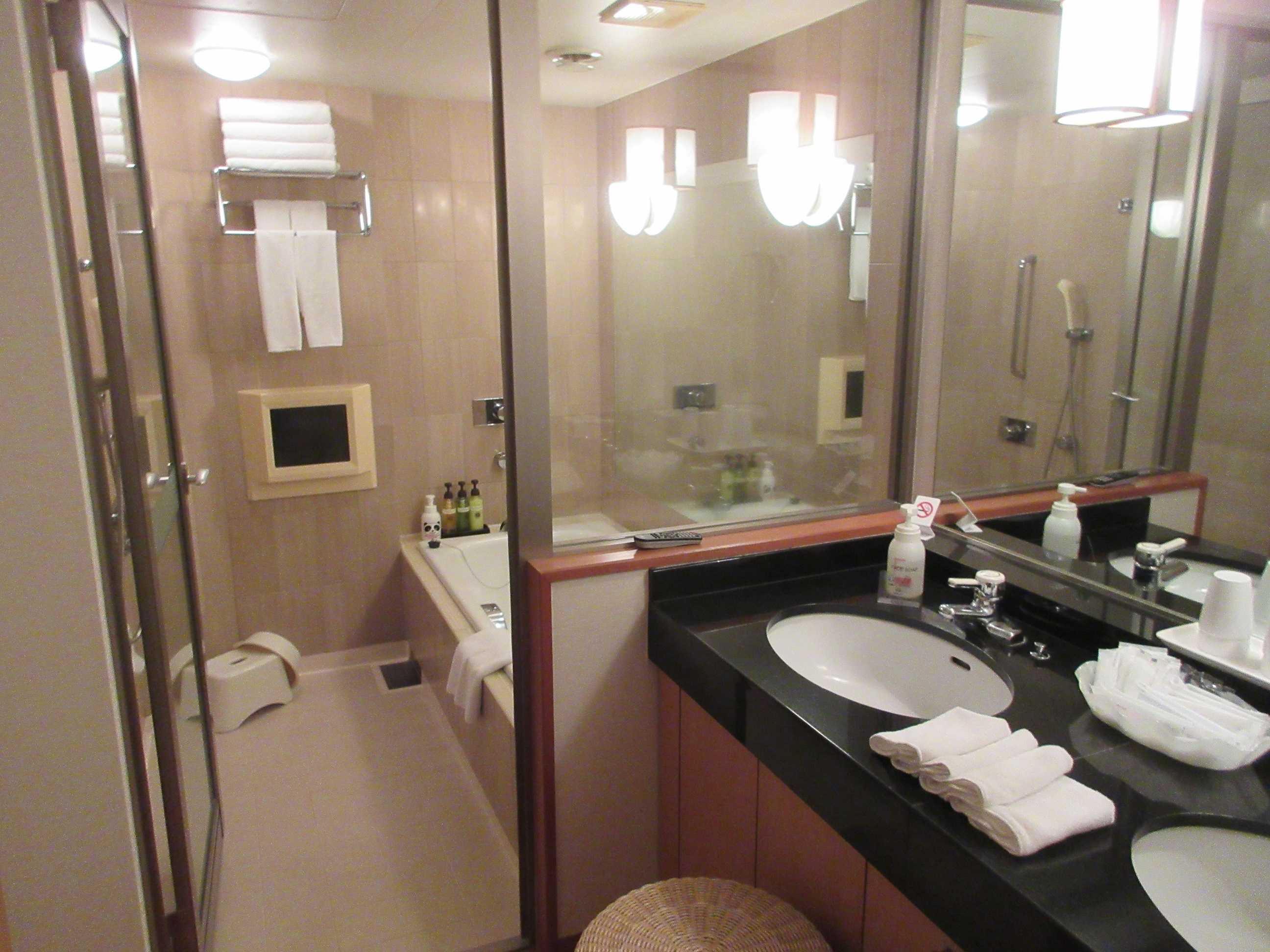 あ~、洗面台が二つに、バブルゴージャスなテレビ付きのお風呂(笑) みんな、楽しもうぜ♪