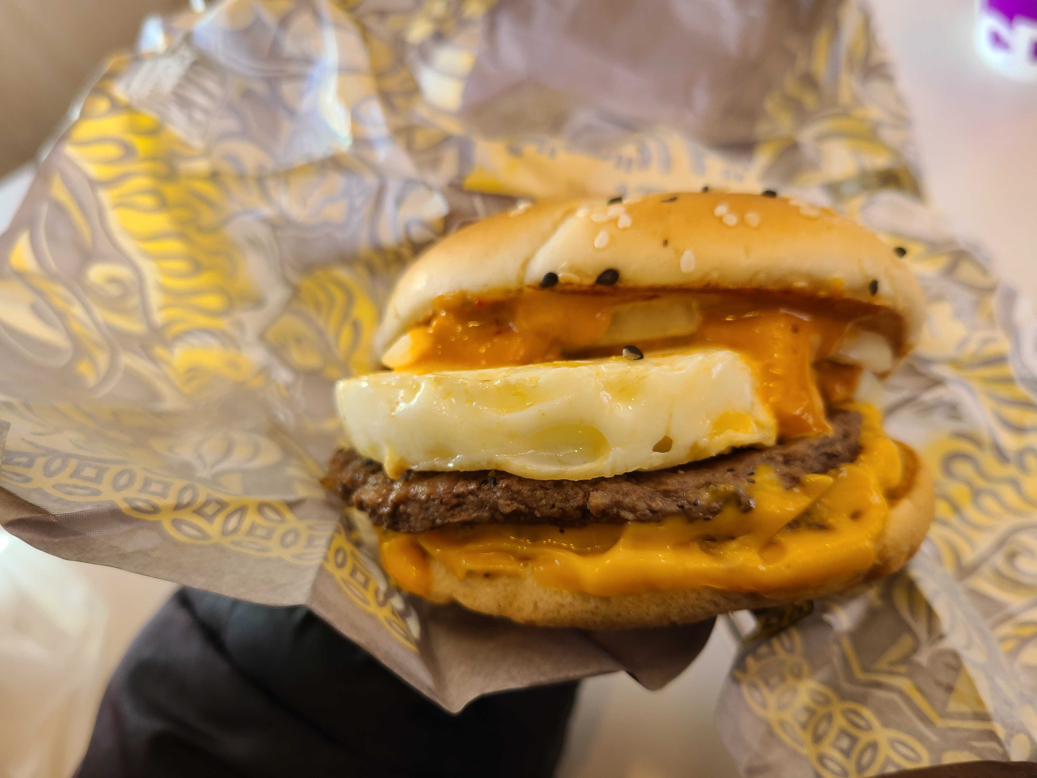 ダブルビーフに目玉焼きに…、スパチキのソース??