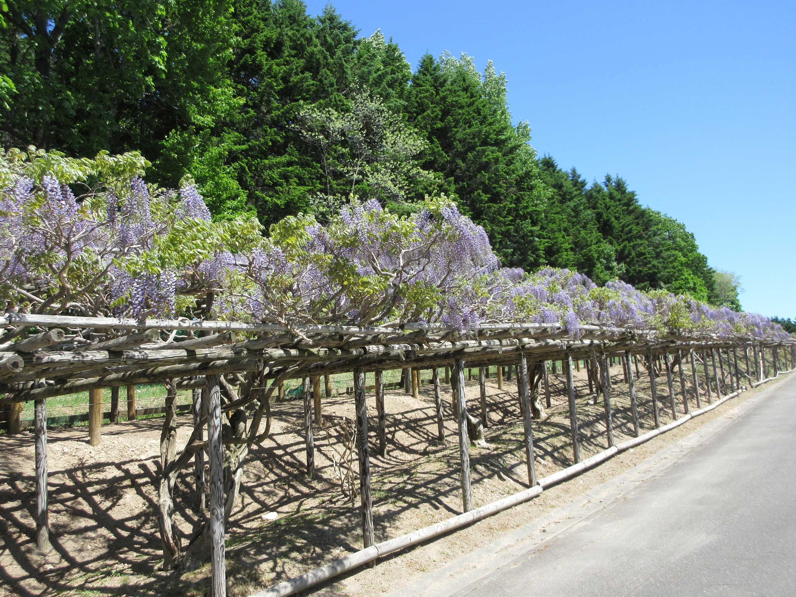 このように、総延長1キロメートルの藤棚に二百株が並んでいて、藤棚の上にも歩道があるので…