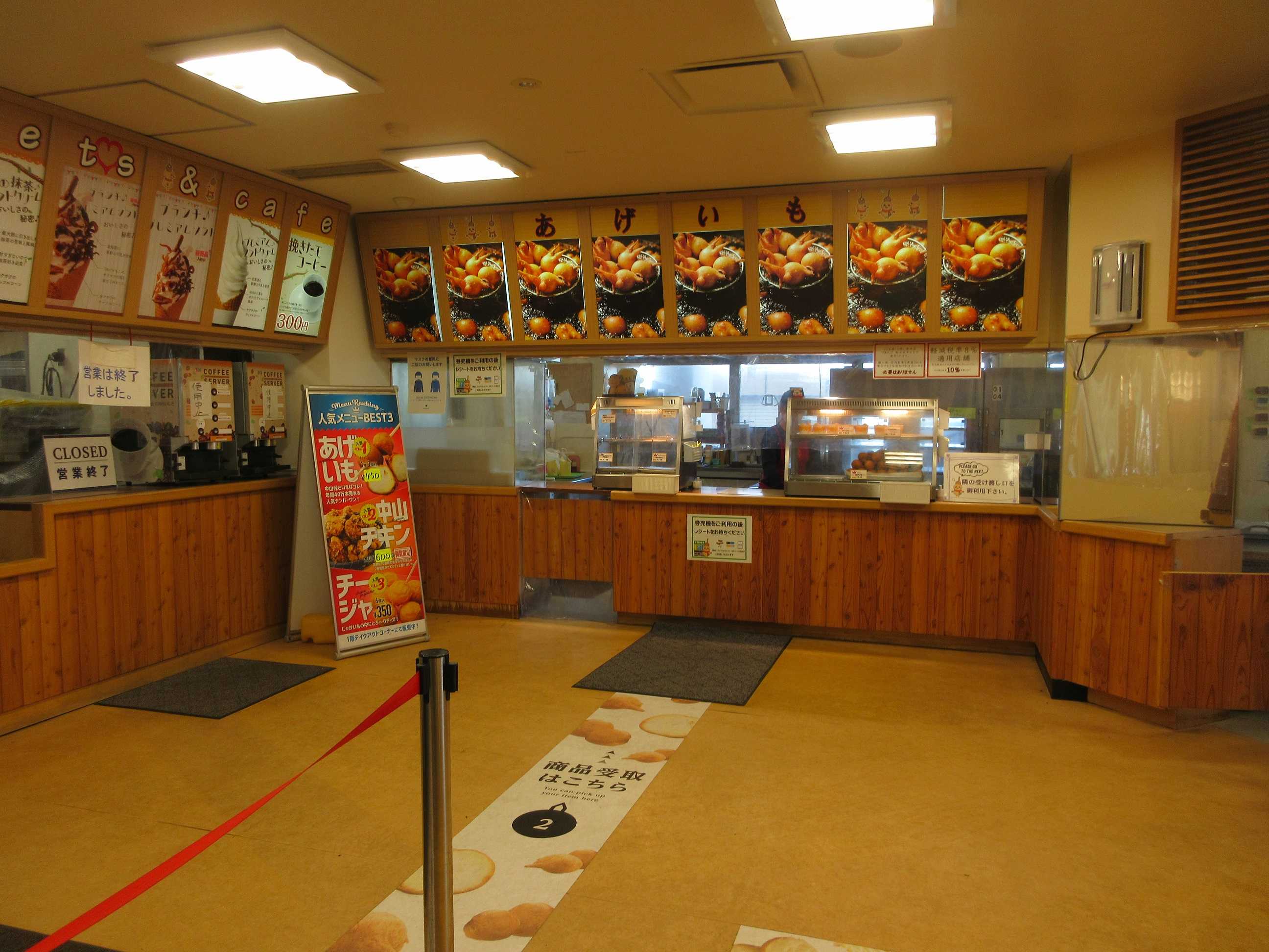 えっ! このあげいもコーナーはやってるけど、向かいの売店は改装中!? あげいもの粉が…