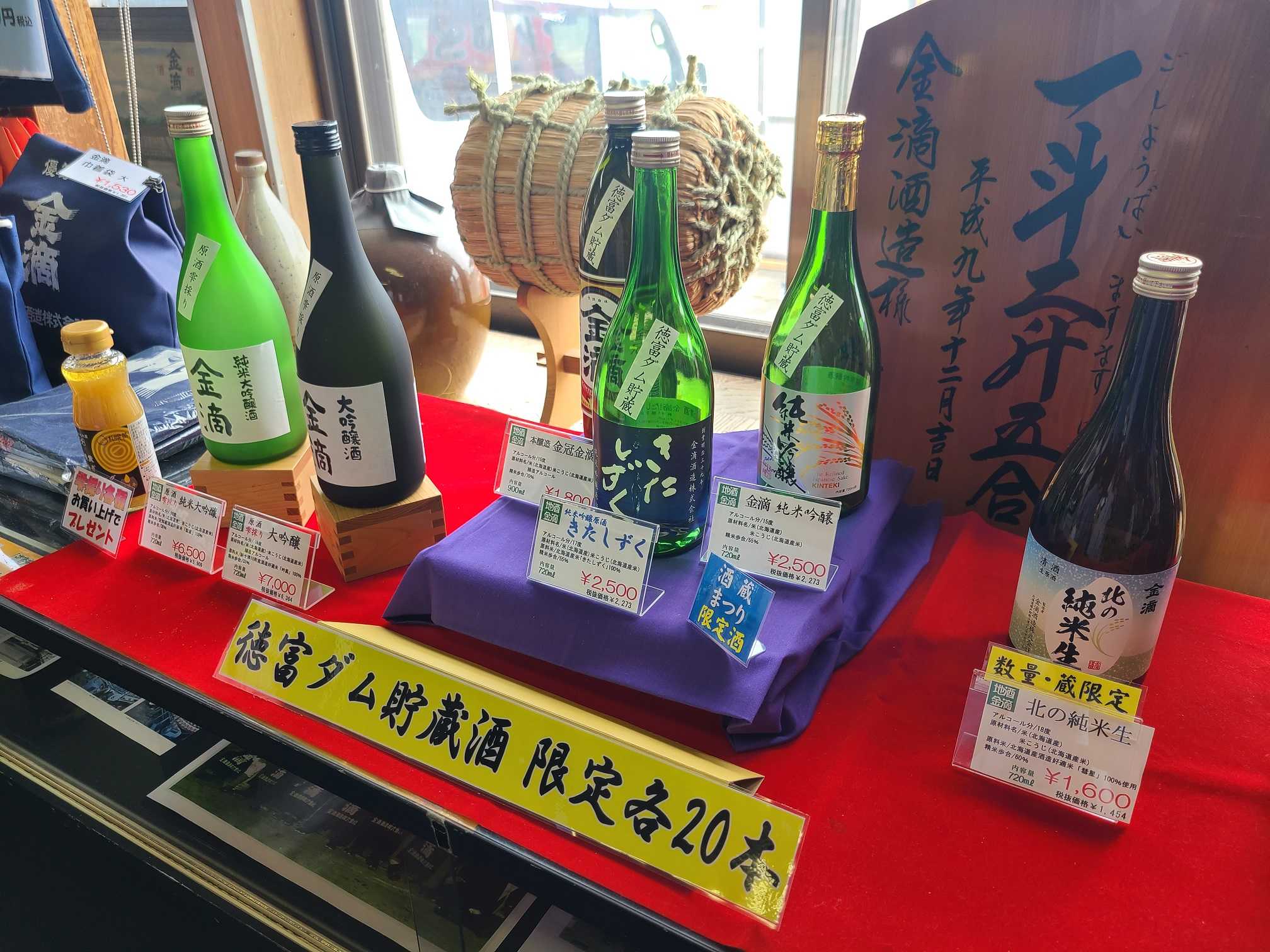 右側が蔵限定の「北の純米生」で、真ん中3種がダム貯蔵の限定酒。 大吟醸はさだまさしラベル