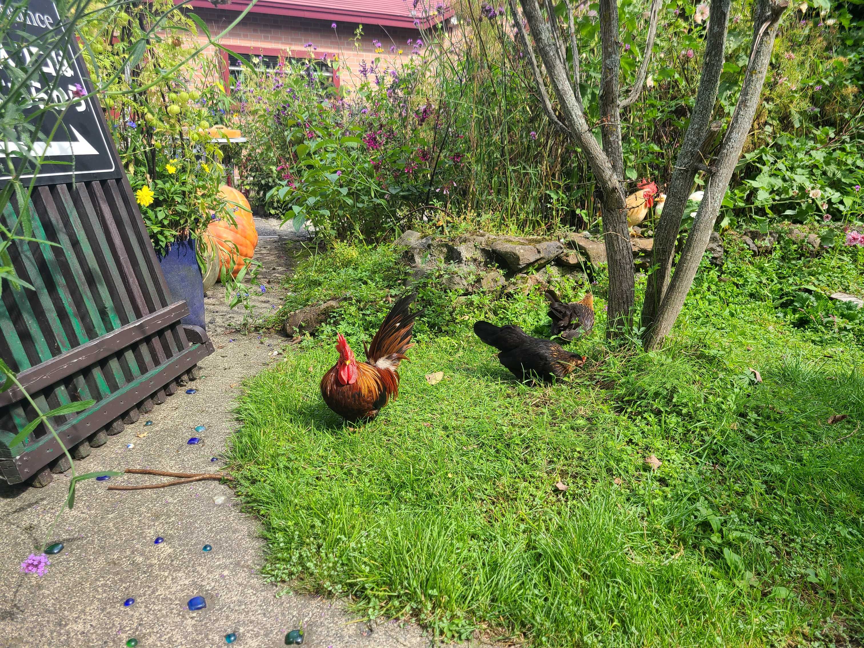 妻とNAYAcaféでソフトクリームを食べていると、放し飼いのコケコたちが寄って来ましたぁ(笑)