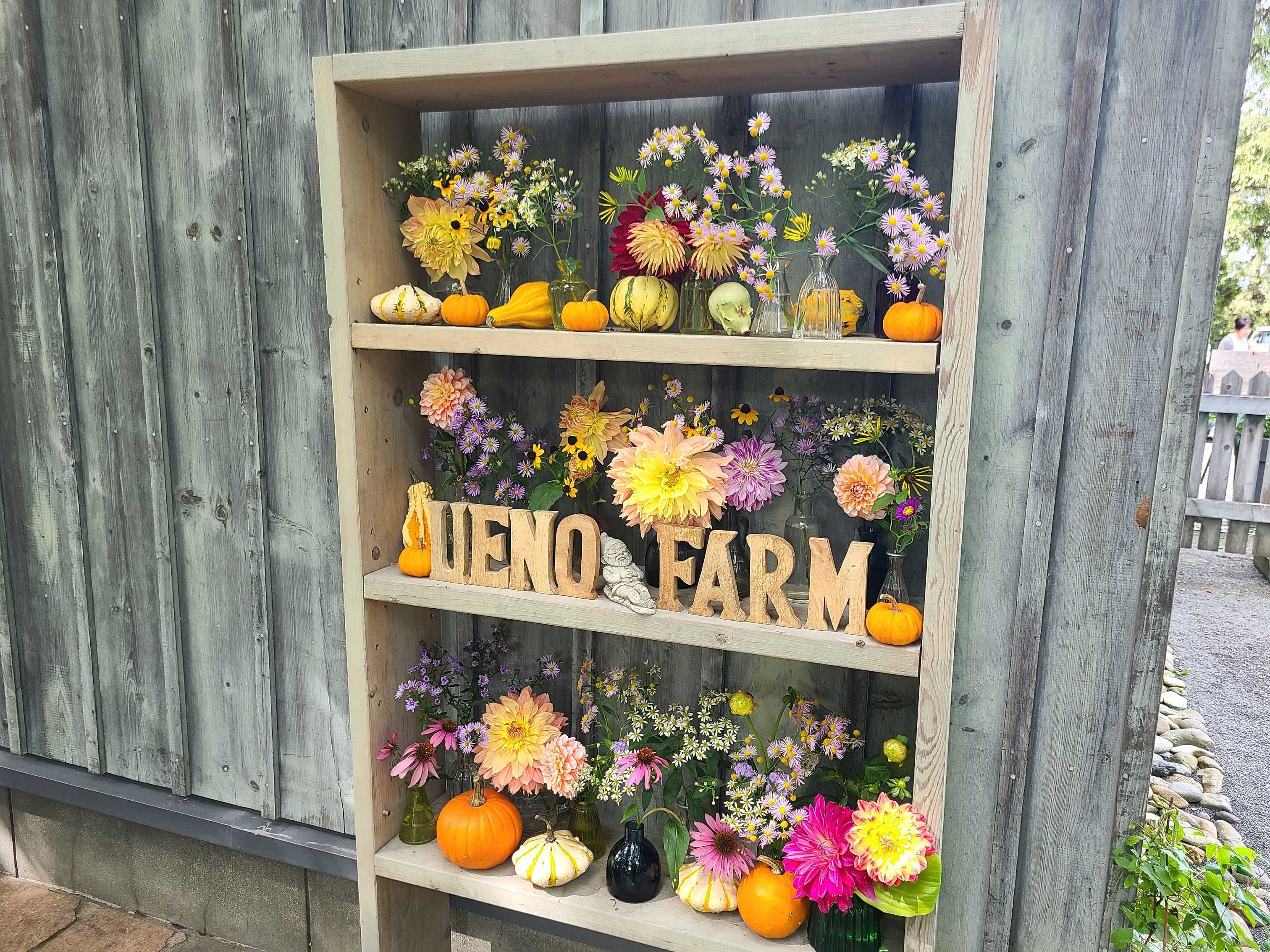木の棚に並べられた、秋の花々とハロウィンかぼちゃ🎃 こういうところ、センスいいですよね