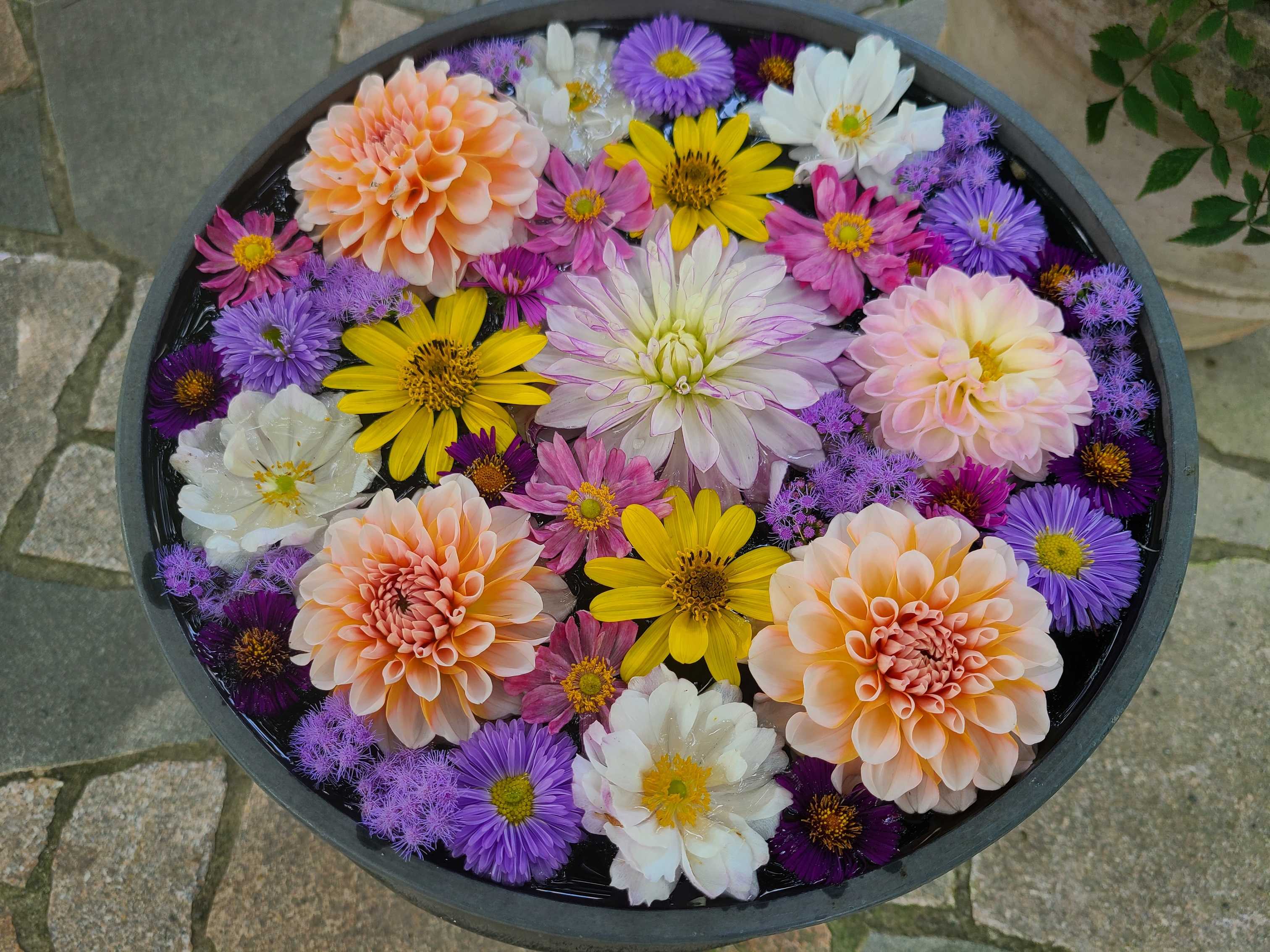 コチラは、紫の中に、黄色系でまとめたフラワーアレンジメント。 水面に浮かんでいるんですよ