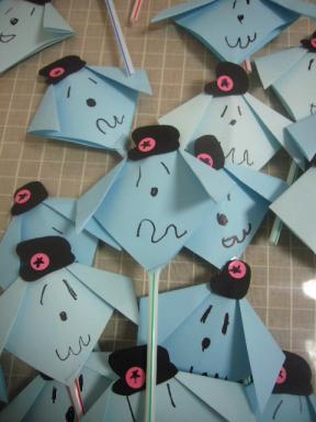 今日はちょっと肌寒い日でしたがたくさんの歌を歌って、心も身体も温まりました~♪参加してくださった皆さん、ありがとうございました!今日歌った歌は、殆んど知っている曲だったと思います。お家でも一緒に歌って下さいね。知らなかった歌は、またの機会に皆で歌えたら・・・と思っています。4月からお仕事に復帰なさる方、幼稚園・保育園に入園するお友達。今日で最後のお友達も何人かいました。ちょっと寂しかったけど、またきっとどこかで会えるよね?そんなキモチです。 また新たな環境でのご活躍をお祈りいたします。 追伸今日の「いぬのおまわりさん」うちの娘(S)の手作りわんちゃんです。帽子を切ったのは私だけど、顔を描いてシールを貼って、ストローを付けてくれました。今日は25個準備したのですが、よくこの数を作ってくれました。おうちでネコちゃんも作って遊んでね~♪