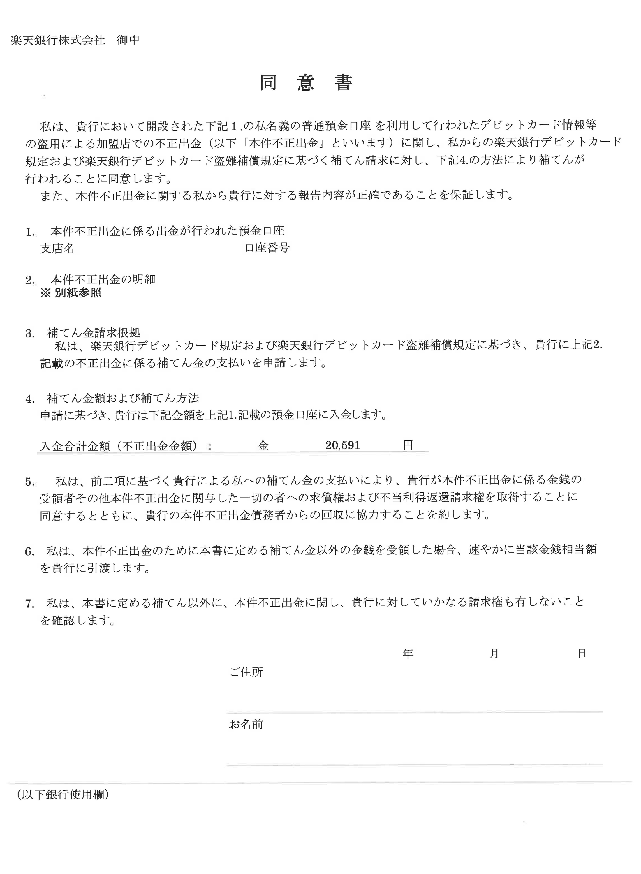 3️⃣補償金請求の根拠:楽天銀行デビットカード規定および盗難補償規定に基づく申請