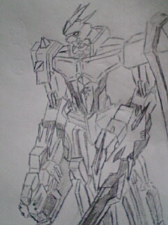 えっと・・・・これは?(汗今日授業中に一文字が描いた『オメガモン』だって。やけにメカメカしいんだけど・・・・瞳も無いし。なんでも、『オメガモンをロボットっぽくアレンジ』だとかなんとか。グレイソードの形状がかなり変わってるね・・・・・この形じゃ収納は難しそうだから両腕は着脱式で中に普通の手があるとか。それって全く別物だよね・・・・・[と言うわけで、ネタが無いので今日の落描きを晒してみる。ちなみに全体はこんな感じ両腕のバランス(大抵ガルルキャノン)がいつも悪くなるオメガモン。急遽グレイソードを大型化しました。(ぇ)・・・なんで斜めってるかって?描いてて気付いたら斜めだったんですよ。(何)]