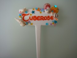 前に作ってさしておいたネームプレート達の字が、薄くなってきてしまいました。「マジック書きでは流石に消えやすいな」と、アクリル絵の具書きに変えている途中ですが、ちょっと遊んで、デコっちゃいました。皆さんも海へ行った時、貝殻を拾って、子供たちと作ってみてはいかがでしょう。
