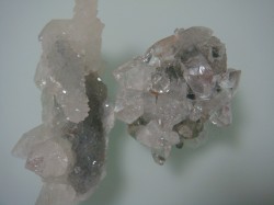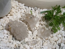 半年近く前に購入したクラスターですが、何かが引っかかるものでした。魅惑の輝きなのですが、<水晶>として売っていたのに、銀色がかり、六角でなく四角です。どう考えてもアポフィライトな感じなので、 店員さんに聞いてみましたが、「本当ですね~でも、水晶として入ってきたので・・・」と、結局判らず仕舞いの?君たちデス。ダンブライトにも似ている結晶があったりもして、謎は深まるばかりです。