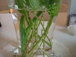 夏越しに、少し風が抜ける様に、 ハーブ達の剪定をしました。ミントやゼラニウムはまめにやらないと、 とんでもない状態になります。 ペパーミントが立派だったので、 そのまま花瓶に生けておきました。 数日が経ち、ふと見ると、根が生えて・・・ そのまま居たら今度は新芽が・・・・ 生命力の強さに捨てられず、「このまま水耕栽培か?」とも思っています。
