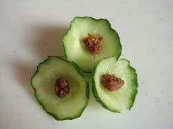 お花の形の「もろキュウ」を、作ってみました。キュウリの細い方からクルクルと、斜めに切ってゆくだけなので、簡単です。 HPの料理の所に、ワンランク上のアレンジをした作品を、載せようと思っています。