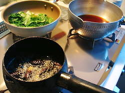 前に紹介した駿河名物に、<たたみいわし>というのがあります。何のことはない「シラスを干したようなもの」です。前に関西方面の伯父に送った時は、トースターで焼くのに良いと言ってまして、なかなかのアイデア人だと感心しました。私はハサミで切って炙り、醤油を付けて食べることが多いです。今回は箸を使って炙り、お吸い物に投入しました。たたみいわしから出汁も出るので、お吸い物は薄めに作った方がいいです。手に入るようならやってみてね