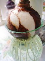 今日は暖かくいい天気!昨日洗濯を無理してやって損した気分になります。この間、なかなか根が出ない球根の、底の部分が臭い匂いを放っていたので思い切ってその部分をナイフでけずっておいたら、あ~ら不思議、どんどん急成長を遂げてきました。新しい根が出やすいように整えることも必要なんですね。偶然に良い事を覚えたと、お得な気分になりました。この球根の横にあった小さな球根なんか見て下さいよ、凄いです!下の石なんかを盛り上げちゃってます。命の力って凄いな~と、水やりする度に思いますわ。