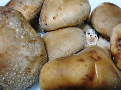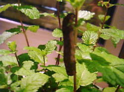 夜に庭に出てふと見ると、ペパーミントがなんか変・・・「ん~?」と寄って行くと、違和感のある黒い物が・・・・正々堂々登っておりました。どう見ても蛾の幼虫。しかもこの態勢…もしかして羽化?急いでスーパーのビニール袋を用意して隔離しました。道理で最近ミントの葉が欠けてた訳です。どこに隠れていたのかしらね?探そうとしている時は見えないのよ~この幼虫はヒマワリについていたのと同じようです。気を取り直して朝の庭他にも幼虫がいたら隔離しようと鉢を見て回りました。すると今度は幼虫ではなく、キノコを発見!これは以前に紹介したモノと同じみたい・・・しかも他の鉢・…もしかして、色んな鉢に胞子が飛んでいたのかしら?いずれにしても、本来の目的からずれていくとはこういうものなのだな~と思いつつ、虫退治と共に菌退治もしなければいけなくなったことは確かです。